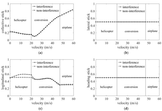 Figure 11a illustrates that the collective stick would decrease at the beginning, and then increases after 23 m/s. The aerodynamic interference would add the collective pitch in the hover and low-speed flight ranges in the helicopter mode. This is due to the additional downwash load provided by the aerodynamic interaction.