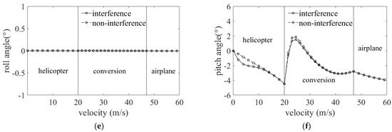 Figure 11f shows that the pitching attitude decreased in the helicopter mode. The vehicle needs to change the pitching attitude to make gravity create the longitudinal force to balance the aircraft. The additional drag caused by the interference increased at the beginning and then decreased, as shown in Figure 12d. Therefore, the vehicle will first pitch down faster, and then the trend of variation will slow down compared to non-interaction. In the conversion mode, the pitching attitude first increased and decreased later. The reason is that the forward longitudinal force generated by the rotor is more remarkable as the tilt angle increases. The aircraft needs to raise its nose so that the longitudinal component of gravity transforms to the drag to balance the body. When the tilt angle increases to a particular value, the thrust of the rotor and pitching attitude decreases rapidly with velocity increases. Since the interference will increase the drag of the vehicle, the pitching attitude is smaller than the case where the interference is not considered. In the airplane mode, the aircraft is in the state of nose-down, and its pitching attitude keeps decreasing as the speed increases. It is because the wing has an initial incidence. As the dynamic pressure increases, the vehicle needs to reduce the wing angle of attack to balance gravity.