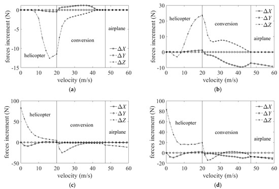 Influence on body forces with different interaction. (a) Body forces increment caused by rotor–lateral interaction. (b) Body forces increment caused by rotor–longitudinal interaction. (c) Body forces increment caused by rotor–wing interaction. (d) Body forces increment caused by total interaction. where ΔX, ΔY, ΔZ represent the body forces increment along body axis.