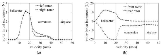 where μL, μR are the advanced ratios of the left and right rotors respectively; vH,L, vH,R are the lateral velocity at the hub of the left and right rotors respectively. Therefore, the velocity increment provided by the lateral interaction is calculated based on Equation (10)