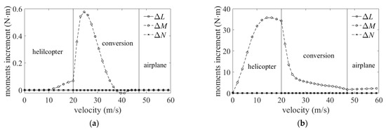 In the conversion mode, the vertical force increment caused by the interference of lateral rotor–rotor increases (Figure 12a). In contrast, the vertical force increment caused by the interference of longitudinal rotor–rotor decreases (Figure 12b). The magnitude changes rapidly at the low tilting angle and changes smoothly at the large tilting angle, and then becomes zero approaching the aircraft mode. The vertical force increment caused by the interference of the rotor–wing decreases at first and then increases (Figure 12c). The maximum variation value is about 40 N, accounting for 6.8% of the vehicle’s weight, and tends to be zero in the conversion mode with a higher tilt angle. This change is due to the wake of the front rotor affecting the dynamic pressure of the rear wing, which leads to the change in the lift of the rear wing. In the airplane mode, the vertical force increment of the interferences caused by the lateral and longitudinal rotor–rotor are close to zero. In contrast, the interference caused by the rotor–wing will be reduced slightly.