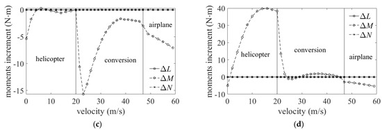 Influence on body moments with different interaction. (a) Body moments increment caused by rotor lateral interaction. (b) Body moments increment caused by rotor longitudinal interaction. (c) Body moments increment caused by rotor–wing interaction. (d) Body moments increment caused by total interaction. where ΔL, ΔM, ΔN represent the body moments increment along body axis.