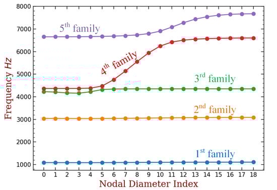 The modal characteristics of the tuned bladed disk are shown in Figure 2. In this case, the bladed disk is a perfect cyclic periodic structure; thus, the modal shapes are also periodic along the circumferential direction [25]. The number of nodal lines along the circumferential direction for a given modal shape is referred to as the nodal diameter index (NDI). Note that NDI also represents the number of periods along the circumferential direction within a modal shape, as shown in Figure 3. Figure 2 is obtained by the following steps. First, we compute several tens of modes with the lowest modal frequencies. Second, we compute the NDI of each mode. This can be done by directly setting the NDI value if one uses the sector model (Figure 1b) with the periodic boundary condition imposed on the wheel (Figure 1c). Alternatively, if a full-scale model is used (Figure 1a), NDI can be obtained by DFT analysis of the distribution of displacement at the same blade location. In this work, we use the first approach based on ANSYS, and the results shown in Figure 3 can be obtained by post-processing. Third, we sort the modes with the same NDI and link all the modes with the lowest natural frequencies from NDI = 0 to NDI = 18. This gives us the first modal family shown in Figure 2. Linking all the modes with the second lowest natural frequencies from NDI = 0 to NDI = 18 yields the second modal family. Likewise, modal families 3, 4, and 5 are obtained, as shown in Figure 2.