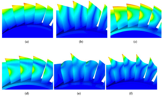 Modes in the same family have similar blade deformation if the frequency-NDI curve is flat, as in the 1st, 2nd, and 3rd families in Figure 2. In this case, we can also deduce that most of the strain energy is on the blades. Otherwise, if a significant proportion of energy is distributed on the disk, when NDI increases, the disk deforms more dramatically, and its strain energy will also increase, thus increasing the natural frequencies. Generally, the modes on the flat part in a frequency-NDI curve are referred to as the ’blade-dominated’ modes. The 1st, 2nd, and 3rd modal families are dominated by the first bending, first torsion, and second bending deformations of the blades, as shown in Figure 4a–c, respectively. The natural frequencies in the 4th family start from the neighbour of the 3rd family to a value very close to the starting of the 5th family. From NDI = 5 to NDI = 10, the frequency significantly increases with NDI; this means that the disk is also involved in the modal vibration. The 4th family presents a typical ‘veering’ phenomenon. We can see that its modal shape is close to the 3rd family at the beginning (Figure 4c,d), and it will finally shift to another type of deformation close to the 5th family (Figure 4e,f). More detailed knowledge of the dynamics of bladed disks can be found in the literature [25,26,27,28].