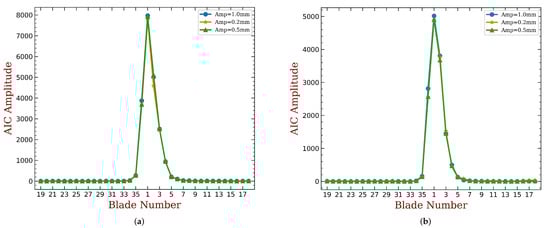 The aeroelastic damping of the tuned blade disk is obtained by solving Equation (17). To do so, matrix , containing the aerodynamic influence coefficients (AICs), should be computed in advance. AICs computed with amplitude mm, mm, and mm are compared in Figure 5, where both conditions shown in Table 1 are computed. Results show that AICs are nearly independent with the amplitude of blade in the computing routine; thus, the linear relationship between the modal displacement and aeroelastic force is verified. The blade with larger distance to the reference (1st) blade has smaller aerodynamic force, and this is expected. Because of the blade torsion, the AICs are not symmetric with respect to blade index 1. For example, the AIC of blade 2 is not equal to that of blade 36. This means that is not a symmetric matrix and the eigenvalues with aeroelastic effects are no longer double roots. In the following analysis, the AICs obtained with modal amplitude 1.0 mm at the unstable working point will be used.
