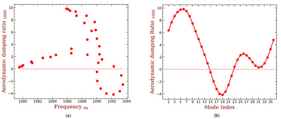 The aerodynamic damping is computed and shown in Figure 6. The modes still have similar frequencies around 1080–1094 Hz, which are also close to the results shown in Figure 2. However, the corresponding aeroelastic damping is significantly different, and unstable modes with negative aeroelastic damping can be found (with NDI 14–21). These observations indicate that matrix does not significantly change the overall stiffness of the system but mainly affects the damping properties. These results also support the assumption we made in Equation (22).