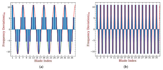 Note that the for constitute the mistuning pattern. The alternate, pure wave, and random patterns are given by Equations (9), (10), and (11), respectively.