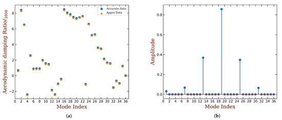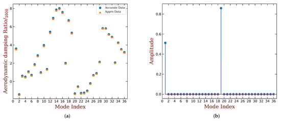 Interpreting the aeroelastic damping with h = 6 wave mistuning. The mistuning modes are sorted by natural frequencies in ascending order. The mapping between the tuned modal index and NDI is shown in Equation (4). (a) Damping ratio reconstructed by Equation (29), (b) the weight of tuned modes to the least damping mistuning mode.
