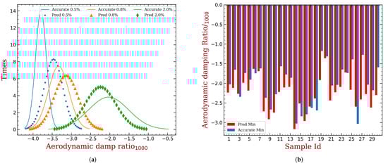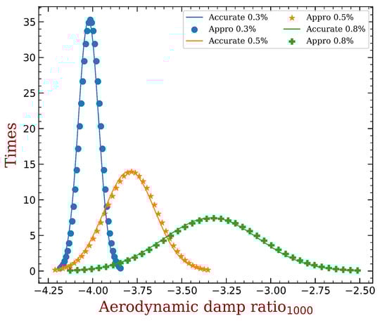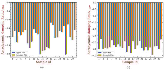 Let us continue to verify the proposed approach with the random pattern. The results are summarized in Figure 11, where random mistunings with standard deviations of 0.3%, 0.5%, and 0.8% are considered. For each case, 1000 samples are generated from uniform distribution with zero mean and the given standard deviation. For each sample, we extract its least aeroelastic damping by two means. One is the data directly obtained by solving the full aeroelastic problem shown in Equation (14). The other data (labeled ’Appro Data’) is obtained by (1) expanding the modal shapes with Equation (18), and (2) reconstructing the damping ratio by superposing the tuned results according to Equation (29). Eventually, we divide the results into 40 intervals and count their appearance frequency. We also choose 30 out of 1000 samples to provide point-to-point comparisons, as shown in Figure 12. Good agreements can be observed in both figures. This verifies that the proposed method is also applicable for the random (arbitrary) patterns. We can further understand the samples with higher aeroelastic stability by the same method presented in Figure 8b and Figure 9b. It can also be confirmed that a higher aeroelastic damping is always associated with more contributions of the tuned modes with higher damping ratio. For the sake of brevity, these results for the random mistuning are omitted.