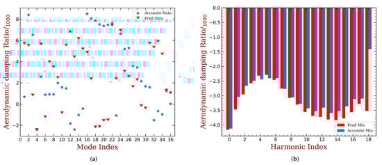 Aerodynamic damping ratios of the tuned bladed disk. The mapping between the modal index and NDI is shown in Equation (4). (a) Sorted by frequency, (b) sorted by modal index.
