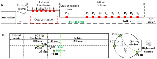 Schematic view of the cylindrical isolator and combustor engine: (a) Maxwell pressure transducers installation locations; (b) PCB sensor installation locations.