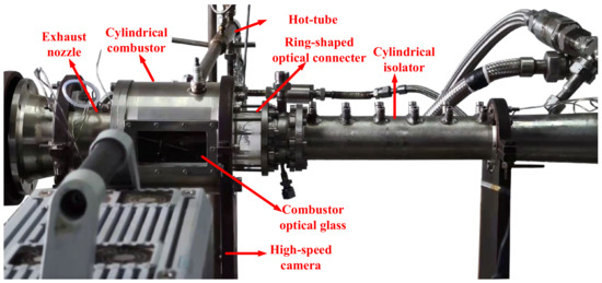 The cylindrical isolator–combustor is illustrated in Figure 1. The diameter and length of the isolator were 56 mm and 380 mm, respectively. The length of the combustor was 150 mm, with a diameter of 112 mm. The combustor with the exhaust nozzle was analogous to the scramjet cavity-based combustor (depth = 56 mm, length/depth = 5.37). The ethylene was directly injected into the airflow via 60 injection holes with diameters of 0.5 mm that are uniformly distributed circumferentially. The axis position of the injection hole was 80 mm upstream from the combustor entrance. The diameter of the exhaust nozzle (Dexh) varied from 68 mm to 80 mm, with a 2 mm spacing. A hot tube was used for detonation initiation, directly connected to the hollow combustor. An ordinary spark plug ignited the premixed hydrogen/oxygen mixture in the hot tube. With a Schelkin spiral in the pre-detonator, the detonation wave was formed through a deflagration to detonation transition (DDT) and propagated into the combustor to induce the combustible mixture.