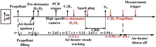 The time sequence of the experiment is depicted in Figure 3. Pneumatic and electromagnetic valves were installed in the feeding lines in order to rapidly monitor and respond to gas supply changes. In each experiment, the air-heater was designed to work first and supply the necessary inflow conditions. To ensure reliable results, the entire direct-connected CRD test, including detonation initiation, self-sustaining, and quenching, was conducted under stable inflow conditions. When the high total-temperature inflow provided by the air-heater is stabilized, the ethylene valve will be turned on at t = 2.7 s, and ethylene will be injected into the engine model. When a stable pressure platform is established in the fuel plenum, the combustible gas mixture will be ignited by the detonation wave produced by the hot tube at t = 3.33 s. Then, rotating detonation waves formed gradually and propagated steadily. When the preset CRD duration was completed, gaseous nitrogen for extinguishing was fed into the fuel plenum to dilute the remaining ethylene, and the ethylene valve was turned off. Finally, the air-heater was shut off after the combustion had entirely been extinguished.