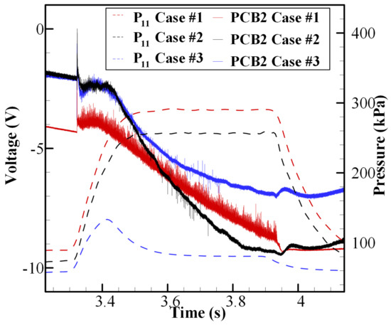 In the test, the absolute pressures of plenums and supply pipes were measured by piezo-resistance sensors (Model MPM480, range: 0–5 MPa) at a sampling frequency of 500 Hz. In addition, the wall pressure along the streamwise direction was measured by the pressure transducers (Model MPM282, range: 0–700 kPa) at a sampling rate of 200 Hz, with a measurement error of less than 0.5% at full scale (measurement error ±3.5 kPa). A PCB sensor (Model 113B24) was adopted in the NI sampling system to measure and record the high-frequency dynamic pressure. The sampling frequency was 2 MHz with a sampling interval of 0.5 μs. The sensitivity of the PCB sensor was 0.725 mV/kPa, with a resolution of 0.035 kPa. The installation positions of the PCB sensors are labeled in Figure 1b. The PCB2_0deg_30 mm and PCB4_60deg_30 mm were arranged at the same axial location with a circumferential angle of 60°, 30 mm downstream from the combustor entrance.