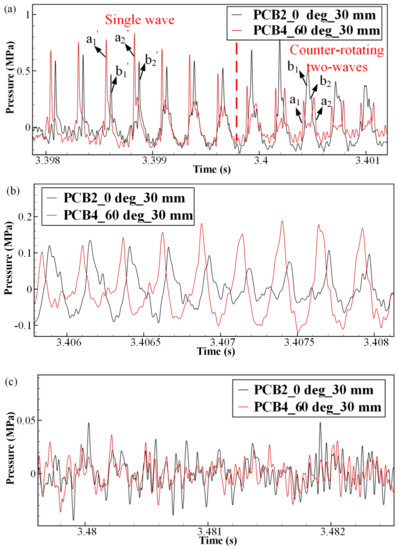 Local view of dynamic high-frequency pressure for three different combustion modes: (a) hybrid mode (Case #1); (b) sawtooth wave mode (Case #2); and (c) deflagration mode (Case #3).