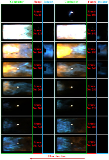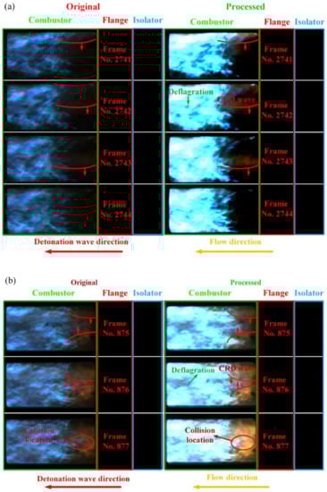 In addition, the high-speed photographs of the CRD waves in the stable propagation duration are shown in Figure 8. The images were converted from RGB (red, green, and blue) to HSV (hue, saturation, and value) to enhance the light intensity, and then converted back to RGB format to distinguish between the reaction zone and the background. The directions of the CRD wave and main airflow are labeled in the images. In Figure 8a, the CRD wave propagates in the form of a single wave that travels from top to bottom. The distribution of the reaction zone in this unique configuration is quite different from that in the rocket-based mode, where the reaction zones of the relatively intensive deflagration combustion and the weaker detonation combustion co-exist in the combustor. The detonation combustion was supposed to be in the forepart of the combustor. However, the deflagration combustion mainly existed downstream and was considered to be distributed in the shear layer of the cavity. Impacted by the luminance of the intensive deflagration, the wavefront of the detonation wave was blurred. In Figure 8b, the CRD waves are in the form of counter-rotating two-waves. Two CRD waves propagate in the opposite direction and eventually collide. The collision point is marked in Frame No. 877, with the combustion being more luminous in the vicinity of the collision point. No luminous reaction zone was observed in the isolator during the detonation combustion. This was mainly attributed to the fact that the deflagration combustion propelled by the combustible mixture with poor mixing quality could not be maintained in the high-speed inflow.