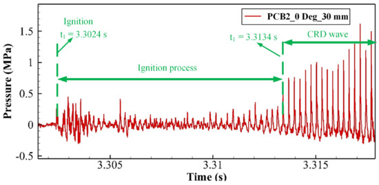 Figure 6 shows the distribution of the reaction zone over the ignition process; the direction of the main flow is labeled in the images. The duration from the ignition to the formation of the CRD wave was about 10.6 ms in Case #3, which contained 480 images. Images with regular intervals were chosen to represent the overall evolution process of the reaction zone. Frames 100–140 show that the combustible mixture was rapidly ignited by the hot tube, with the intensive reaction zone distributed in the combustor. Subsequently, the reaction zone gradually propagated upstream to the isolator, as displayed in Frames 140–160. When the reaction zone could not self-sustain in the high-speed inflow of the isolator, it progressively faded to extinguishment. Then, the reaction zone in the combustor was also weakened and pushed to the afterbody of the optical window. Later, the upstream reaction zone propagated again and remained relatively stable in the rear part of the combustor after the fresh ethylene was mixed with the vitiated air and formed the combustible mixture. The corresponding high-frequency pressure variation in the ignition process is shown in Figure 7. It can be seen that the ignition occurred at 3.302 s after a period of unstable pressure fluctuation. The initiation of the regular CRD wave was at 3.313 s; thus, the time interval of initiation duration was about 11 ms, which is consistent with the initiation interval obtained from the high-speed image. The high-frequency pressure measurement and high-speed images demonstrate that the CRD wave did not form immediately after the ignition of ethylene-vitiated air in this study. This phenomenon was previously reported, in References [25,26,27].