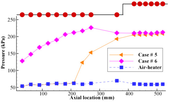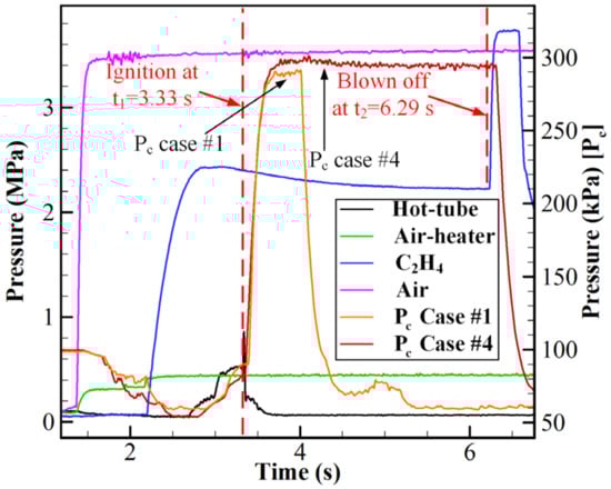 In addition, a long experimental test was conducted to determine whether the detonation could self-sustain for an extended duration. In Case #4, the high-frequency pressure was not measured, because the PCB sensors may have been damaged by prolonged exposure to high temperatures and heat flux without cooling. The pressure changes in the combustor and air-heater are demonstrated in Figure 9. The air-heater could generate a stable inflow in the range of 2.21–8 s; moreover, the supply of ethylene could also remain stable. The hot tube ignited the ethylene–air mixture after a pressure platform was established in the ethylene plenum. After ignition, the pressure in the combustor quickly rose to 298 kPa, indicating that the combustion which occurred in Case #4 was in the form of detonation. It can be determined that the pressure was slightly higher than the pressure (288 kPa) in Case #1 in similar experimental conditions in terms of ER and the mass flow rate. It is clear that a stable pressure plateau was established and maintained from 3.33 s to 6.29 s throughout the entire experiment. Meanwhile, the air-heater pressures remained stable and unaffected by the high combustor backpressure. It could be concluded that the detonation combustion was sustained throughout the preset interval (3 s). The long CRD test demonstrated the potential of this cylindrical air-breathing CRD engine configuration for use in practical applications.
