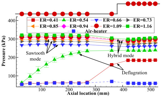 The results presented above demonstrate that combustion modes are sensitive to the exhaust nozzle. In this section, the impacts of Dexh on the combustor pressure and the air inflow are discussed. Figure 11 shows the pressure distributions along the streamwise direction with different ER values at Dexh = 68 mm. The wall pressure was collected and averaged during the stable combustion stage for each pressure transducer. The increase in combustor pressure in the sequence of “deflagration, sawtooth wave, and detonation” was mainly attributed to the mode transformation and partly to the increase in ER. The high back pressure of the combustor generally influenced the airflow with significantly different influence boundaries. The supersonic inflow remained unaffected before the ethylene injector for the deflagration case. The inflow was significantly impacted in the sawtooth wave and HM mode due to the higher combustor pressure. As a result, the preset supersonic inflow of Mach 2 was passively reduced to subsonic flow at the isolator entrance.