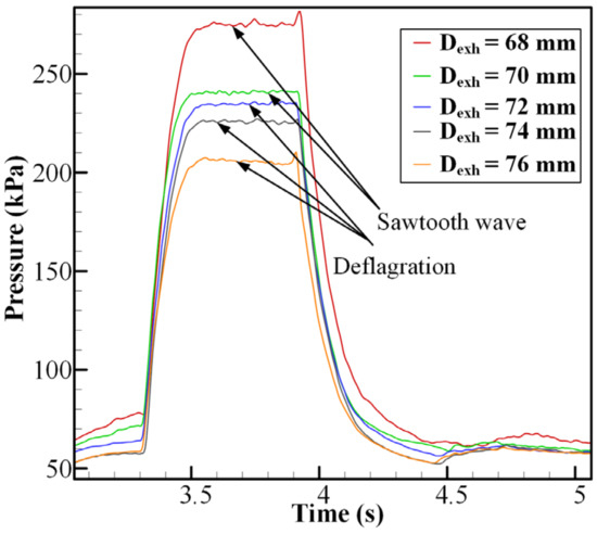 Figure 10 shows the distribution of the combustion mode under different operation conditions. All successful experiments were performed in the same time sequence (except for the long duration test) and the combustion can maintain stably in its mode within the preset experimental duration (3.33–3.94 s). Failure means that neither deflagration nor detonation can self-sustain in the experiment duration. The modes of deflagration, sawtooth wave, and HM are introduced in Section 3.1. When the Dexh was less than or equal to 72 mm, the combustion modes usually appeared in the sequence of deflagration, sawtooth wave, and HM, with ER increasing. Typically, the deflagration mode appeared at a relatively lower ER. For the deflagration cases, only a limited amount of ethylene was delivered to the combustor wall region, and it did not meet the minimum requirement for CRD formation. The lean combustible mixture was burnt at the rear of the combustor through deflagration. As ER increased, the enriched combustible mixture was effectively accumulated at the combustor wall region through the entrainment of the recirculation zone, which contributed to the formation of CRD in the combustor. The results in Figure 10 suggest that the sufficient combustible mixture accumulated in the outer wall region was crucial to the formation of CRD.