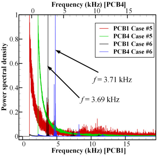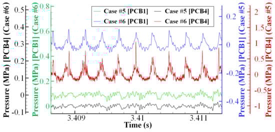 Prior analyses have demonstrated the effect of ER and Dexh on the incoming flow; however, the effect of combustion modes on incoming flow has not yet been analyzed. These two cases with similar combustor pressures, marked by a black circle in Figure 12, exhibit a distinct trend in their effects on air inflow. Figure 14 demonstrates the pressure distribution along the streamwise direction for these two cases. The different combustion modes (deflagration for Case #5, HM for Case #6) shared a similar combustor pressure, albeit with a minor difference. However, it was clear that the leading-edge location of the shock train in Case #6 was located more upstream than that in Case #5. The dynamic pressure distribution in the cylindrical isolator and combustor is shown in Figure 15. For Case #6, there was a periodic pressure oscillation detected in the combustor and isolator, and the pressure peaks in the isolator were much lower than those in the combustor. The periodic pressure oscillation detected in the isolator was supposedly caused by the oblique shock wave induced by the detonation wave, which is consistent with the numerical simulation results [33]. The frequency distribution of FFT shown in Figure 16 also proves the point mentioned above that the dominant frequency of PCB1 (3.69 kHz) is consistent with that of PCB4 (3.71 kHz), with a relative error of 0.5%. For Case #5, a clear periodic variation could not be clearly observed in the high-frequency pressures of the isolator and combustor. Figure 16 also clearly demonstrates that there was no dominant FFT frequency for Case #5. Thus, it can be concluded that the periodic high-frequency pressure oscillation could cause a more significantly substantial impact on the incoming flow than the steady deflagration, which is consistent with the conclusion reported in References [21,34].