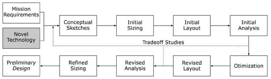 The design methodology for the current conceptual work followed that presented by Raymer [35], and shown in Figure 1, from Mission Requirements to the Final Configuration, or design freeze. One aspects differs from the conceptual design process described by Raymer [35], and that is the Technology Available here is replaced with Novel Technology and placed at an equal level with Mission Requirements as this is a driver for the design and mission specification. In addition, only introductory studies of the stability of the aircraft are discussed.