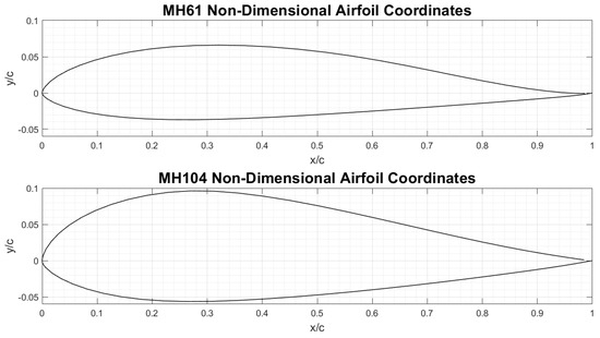 The definition of the aerodynamic shapes of the aircraft are a compromise between the required volume and dimensions imposed by the pre-selected fuel-cell system, and the aerodynamic and stability constraints of a tailless BWB configuration, with the need of reflex cambered airfoils to naturally restore the pitching moment stability of the aircraft [40,41,42]. These constraints resulted in the selection of the Martin Hepperle MH 104 airfoil for the body section with 15% thickness for additional combined favourable aerodynamic and geometric properties, and the MH61 for the wing sections with 10% thickness. Specifications for the two airfoils are presented in Table 4. Airfoil profiles are shown in Figure 3.