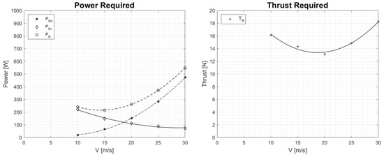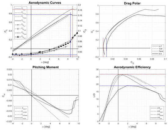The value of the maximum lift coefficient of this simplified wing was then used to define the initial planform area required for an initially defined stall speed of 12 m/s. Subsequently, for the design maximum take-off weight of 245 N, the initial value of the planform area was estimated [45,46]. Finally, the sizing of the drag coefficient can be obtained, with the simplified assumption that the minimum drag coefficient is equivalent to the zero-lift drag coefficient [36]: