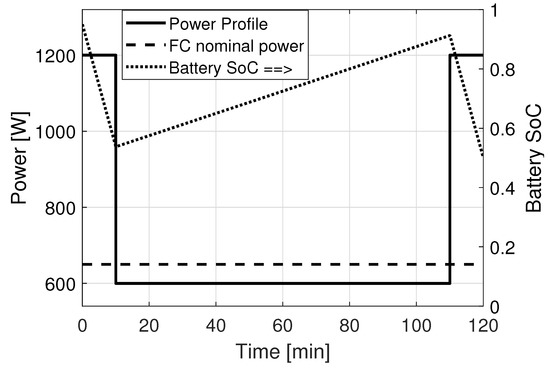 Based on the power demand of the UAV discussed in Section 5.1, a typical 2 h mission is designed and presented in Figure 12. It corresponds to a 10 min take-off at 1.2 kW, 100 min cruise at 600 W and 10 min landing procedure requiring 1 kW. A sizing strategy using the power demand as an input for designing hybrid fuel cell/battery systems was previously developed by the authors for underwater applications [59], and was adapted for the UAV application. It finds the best, i.e., most compact or lightest, combination of fuel cell stack and battery pack in order to fulfill the given mission. Results showed that a hybrid system combining a 650 W Proton Exchange Membrane Fuel Cell (PEMFC), with a tank containing 80 g pressured hydrogen, and a 100 Wh battery pack is the most suitable (lightest) for the hybrid electric propulsion system. Only certain fuel cell power sizes were considered, based on what is available commercially. As a comparison, this described hybrid energy system weights around 5 kg, whereas, based on the assumptions from [59], a full secondary battery system with the same amount of energy weights around 9 kg.