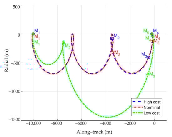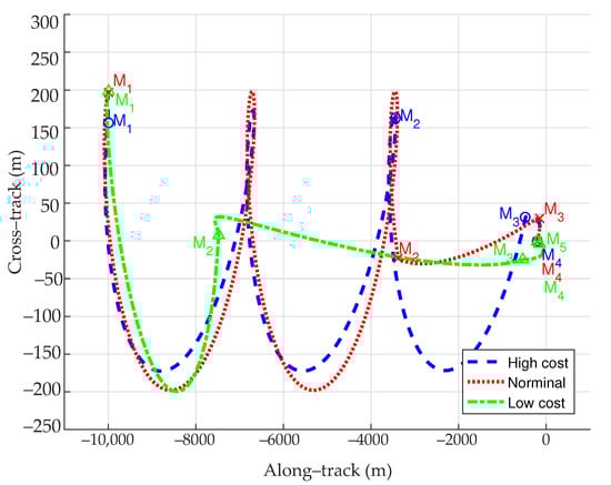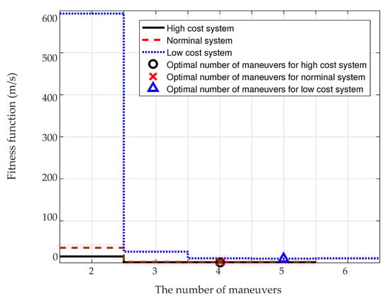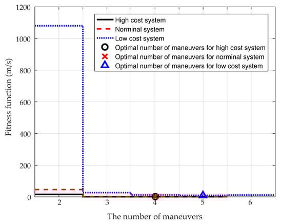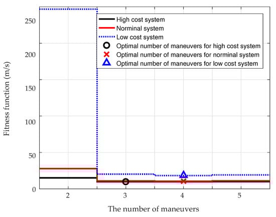 Figure 9 shows the optimal fitness function with respect to the number of maneuvers when = 12,000 s. Four maneuvers are needed in the robust optimal trajectories for both the high- and nominal-cost systems, while five maneuvers are needed in the robust optimal trajectories for the low-cost system.