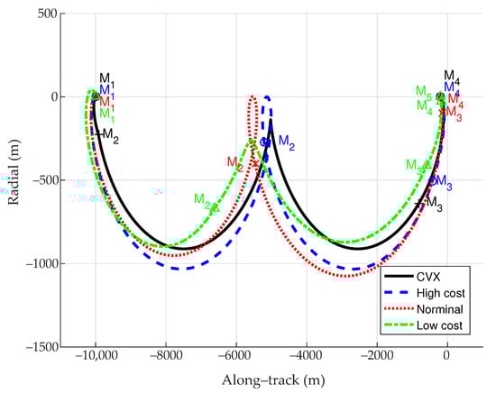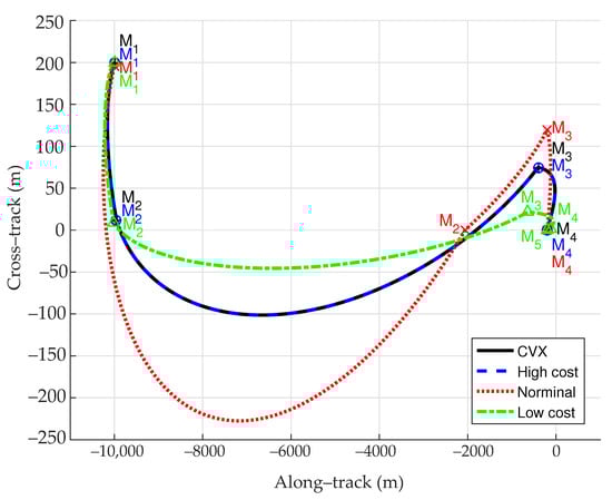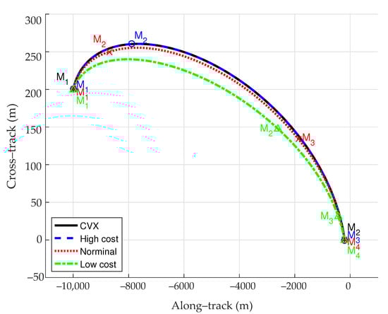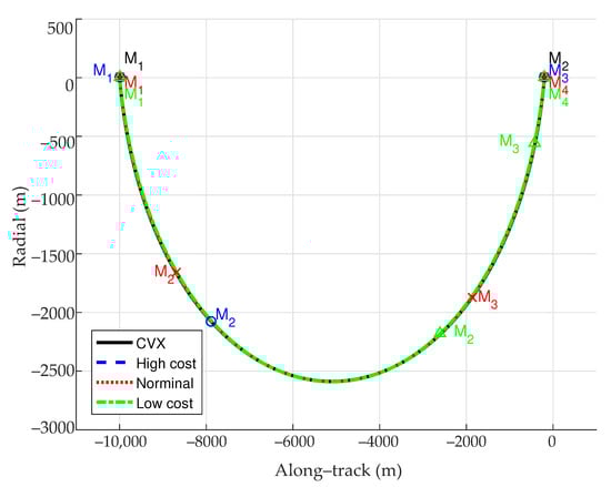 Figure 2 and Figure 3 show the in-plane and out-of-plane optimal trajectories (notation cvx indicates the optimal trajectory solved by convex optimization without uncertainties) and the associated maneuver locations (denoted as M1, M2, etc.) when = 2000 s. It can be seen from the two figures that the designed robust optimal trajectories are basically the same as the deterministic optimal trajectory, which means that the main objective of the robust trajectory optimization algorithm is to correct the trajectory against the uncertainties rather than replan a new trajectory.