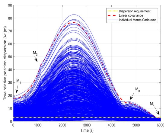 Figure 12 presents the Monte Carlo analysis for the high-cost system when 12,000 s. It is verified that the proposed STT-based uncertainty effect evaluation method can provide the accurate upper bound of the Monte Carlo results. Moreover, all Monte Carlo trajectories satisfy the final position dispersion constraint.