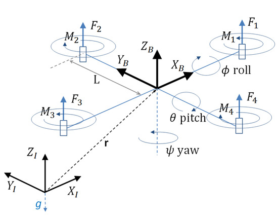 A generic model for quadcopters is used in this paper. Note that the proposed approach can be applied to different configurations of multi-copters by modifying the vehicle force and moment model according to the desired rotor configuration and control allocation method. The coordinate systems and forces and moments generated by the rotors are shown in Figure 1.