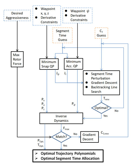 where is the maximum rotor force required for the trajectory, is the rotor force for steady hover, and is the maximum thrust of the rotor. One might conserve the aggressiveness for safety reasons. Given waypoints x, y, z, , and the desired aggressiveness, the whole methodology to find the optimal trajectory and segment time allocation for a given quadcopter model is summarized in Figure 2.