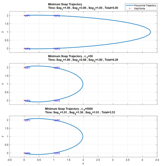 With and , we have fast and stable convergence in our test cases. Figure 4 shows the result of segment time optimization for a simple 2D 4-waypoint scenario. The initial segment time is s, and we optimize it with two different values, 50 and 5000. The result trajectories look identical because they have similar segment time distribution while the total time turned out to be 6.28 and 3.53 seconds, respectively. It is observed that, with this segment time optimization process, the optimal segment time distribution will be found to minimize the cost on integral of the square of trajectory derivatives, while the optimal total time is found based on the value of . The larger used, the smaller the total time will be, which makes the trajectory more aggressive.