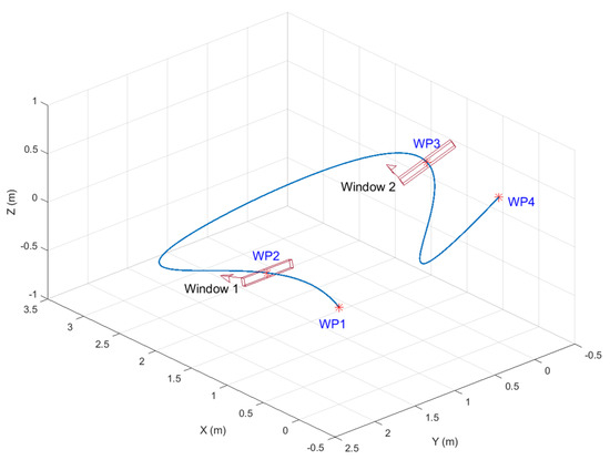 Figure 12 shows the quadcopter on the trajectory with a fixed time interval of 0.33 s. It can be observed that the quadcopter had the highest speed in segment 2 so it can maneuver through the highly tilted window 2. The successful passage through the narrow windows can be visually confirmed. If we further check the data at waypoint 3, we have the window forward and upward vectors as and . Additionally, the quadcopter velocity and thrust vectors (aligned with ) are and . The velocity and thrust vectors are confirmed to be aligned with the window forward and upward vectors. Finally, the optimal time allocation was found as s.