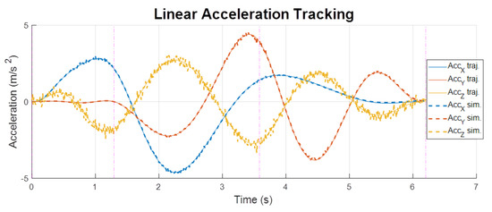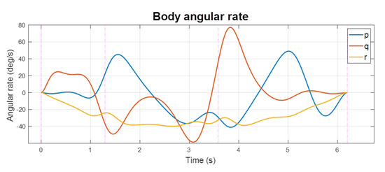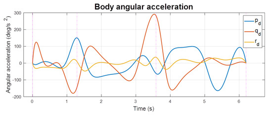 Figure 7, Figure 8 and Figure 9 show the result of the inverse dynamics analysis from the trajectory with respect to the particular quadcopter model. The magenta dashed lines mark the times of waypoint passages. It can be noticed that the quadcopter had a spike in angular acceleration and angular rate around waypoint 3 because it was making the maneuver to pass through the highly tilted window 2.