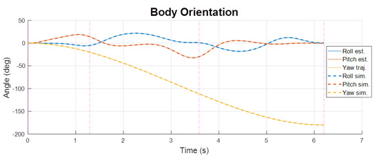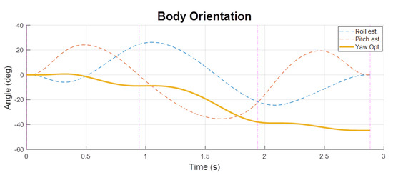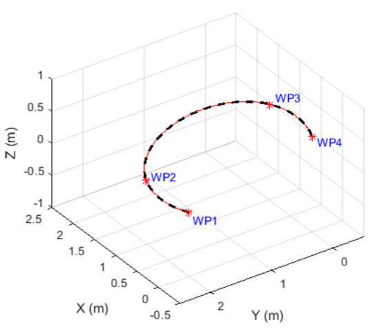 Having and at each moment in the trajectory, we can integrate iteratively throughout the inverse dynamics analysis by . Figure 19 and Figure 20 show a simple four-waypoint aggressive trajectory and the corresponding optimal yaw trajectory obtained by this method.