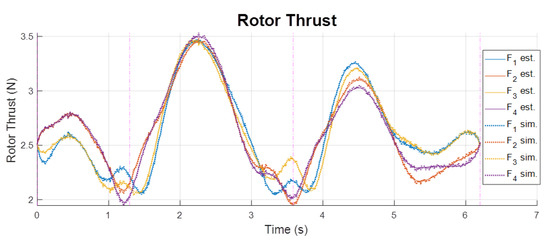 From the simulation result we can see that, despite the existence of inertia estimation error and control input disturbance, the geometric control had a good performance in tracking the polynomial trajectory. Position and yaw angle are well tracked and roll and pitch angles turned out to be very close to the inverse dynamics estimation as shown in Figure 13 and Figure 14. Therefore, the successful passage through the narrow windows is confirmed. Figure 15 and Figure 16 show that the linear acceleration is well tracked and the angular acceleration is very close to the estimation. From Figure 17, the control input used to track this polynomial trajectory is verified to be very close to the inverse dynamics estimation. The maximum rotor thrust used in the simulation is also confirmed to be around the maximum rotor force (3.5 N) requirement we specified in the trajectory generation as shown in Figure 18.