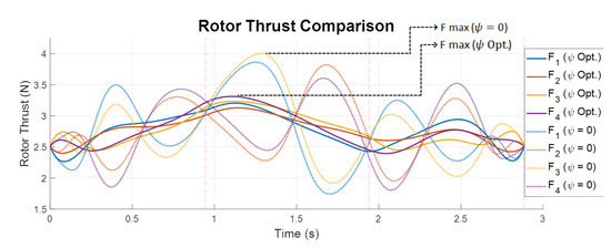Figure 22 shows the comparison of rotor thrust used to track the aggressive trajectory between constant zero yaw and the optimal yaw trajectory. The additional yaw control effort in the constant zero yaw case pulls the and rotor forces away from the and rotor forces and thereby increases the maximum rotor force needed. From the result, we can see that, by tracking the optimal yaw trajectory, the maximum rotor force is reduced significantly by 17.5% (from 4 N to 3.3 N).