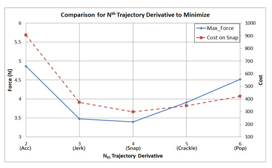 With the optimization and analysis framework developed, we review the choice of minimum snap trajectory. For the same four-waypoint scenario and segment times, we compare the optimal trajectory and the maximum rotor force required with the cost of different orders of trajectory derivatives to minimize. Figure 23 shows the geometry of the trajectories. As shown in Figure 24, the trajectory that minimizes the cost on the fourth derivative has the minimum force required. Therefore, we conclude that minimum snap is indeed the optimal choice for this approach of multi-copter aggressive trajectory optimization.
