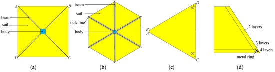 In this paper, two kinds of solar sail structures are studied: one is a quadrilateral solar sail and the other is a hexagonal solar sail, as shown in Figure 1. The sail is fixed to the beam by the tack line. In the prevention of the edge tearing of the sail, multi-layer hemming is adopted, and in order to facilitate the connection between the tack line and the sail, the metal snap ring structure is added, as shown in Figure 1d. The area of the solar sail is generally more than 100 m2. Limited to the experimental conditions, this paper will use a much smaller solar sail structure as the research object. For the regular quadrilateral solar sail shown in Figure 1a, its side length is 1000 mm. For the regular hexagonal solar sail shown in Figure 1b, its 1/6 solar sail is an isosceles trapezoidal structure with a length of 26.6 mm for AB, a length of 1000 mm for CD, and a height of 853.4 mm.