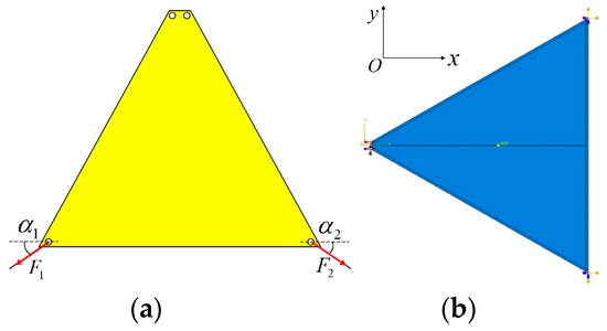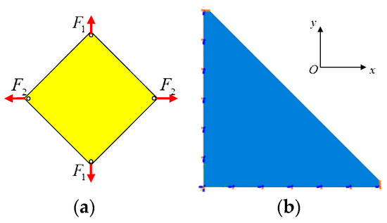 The simulation model as shown in Figure 5b is established by using an S4R shell element. The boundary condition is that the two corners of the upper edges are fixedly supported, and the two corners on the lower edges have applied force and their out-of-plane displacement is limited, as shown in Figure 5a.