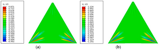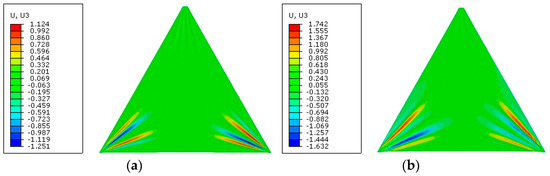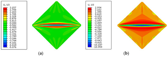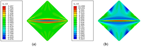 In Figure 3, a wrinkling shape obtained by simulation analysis is shown wherein is kept unchanged and the value of is gradually increased, and where U3 represents the z-axial displacement in millimeters. This suits for all following figures, and when , the maximum amplitude of the wrinkle is 5.08 mm, and when , the maximum amplitude of the wrinkle is 11.5 mm.