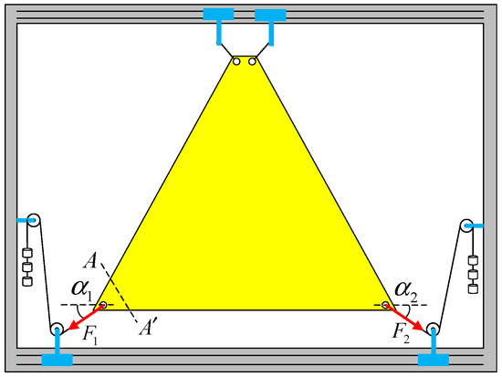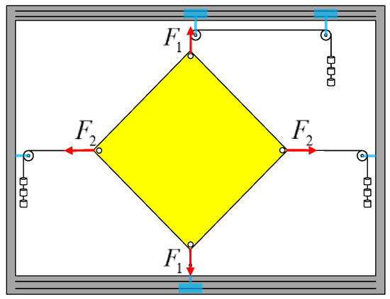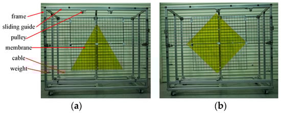 The test piece system is composed of a membrane, frame, cable, pulley, and sliding guide, as shown in Figure 9. The function of the test piece system is to stretch the membrane so that it can wrinkle. Meanwhile, the force direction is in the plane where the membrane is located, and the value and direction of the corner force can be adjusted. The specific function realization mode is: the membrane is stretched through the frame and cable, and the frame and pulley can ensure that the force direction is in the plane where the membrane is located. The force direction of the diagonal point is controlled by moving the pulley and guide rail, and the value of the force is controlled by increasing or decreasing the weight.