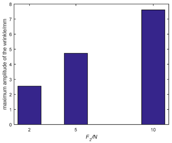 Under the condition of maintaining and gradually increasing the force to 5 N and 10 N, the wrinkle’s shape can be obtained as shown in Figure 6. The results show that when the force increases, the wrinkling shape does not change significantly, but the wrinkling amplitude changes significantly. When , the maximum amplitude of the wrinkle is 0.90 mm, and when , the maximum amplitude of the wrinkle is 1.25 mm.
