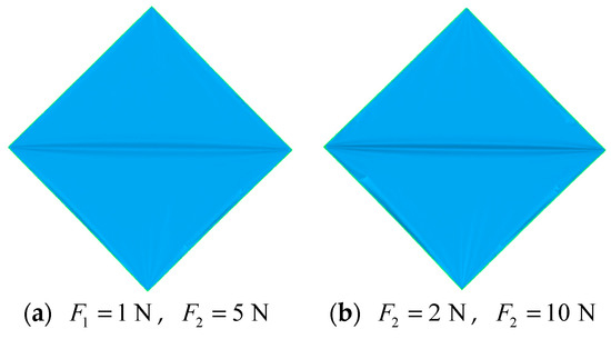 Various forms of wrinkles under different diagonal forces were measured. The longitudinal diagonal force is , and the transverse diagonal force is , as shown in Figure 12.