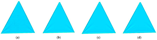 The solar sail structure belongs to membrane structure. At present, the theoretical research of membrane wrinkling is mainly based on two theories: the tension field theory and the stability theory. The tension field theory was first proposed by Wagner and used in the buckling analysis of metal sheets [14]. The tension field theory has been developed for many years. Many scholars have proposed many improved methods for different problems, such as a variable Poisson’s ratio method [15], a condensation model reduction method [16], and a relaxed strain energy density method [17]. The tension field theory can accurately obtain the direction and distribution area of wrinkles, but it fails to obtain information on the out-of-plane deformations, such as the amplitude. Besides, it is only applicable to the membrane structure with simple boundary conditions. Therefore, the tension field theory is not particularly applicable to a membrane structure with complex boundary conditions, such as solar sails. The stability theory holds that membrane wrinkling is a local buckling phenomenon of a membrane, and it was also first proposed by Wagner. Based on the stability theory, the complete shape of wrinkles can be obtained, including direction, distribution area, shape, and quantity. However, the bending stiffness of the membrane is very small and the buckling problem under loads has obvious nonlinear characteristics, and so the computation is very difficult. Nonlinear buckling analysis is a widely used numerical calculation method, at present. Many scholars have also proposed some improved methods, such as the modal theory method [18]. There are many studies about wrinkling analysis for different shapes of membranes, such as a rectangular membrane [19], a square membrane [20,21], a circular membrane [22], and a triangular membrane [20,23]. For solar sails, many scholars have also carried out specific analyses and research. For example, Deng carried out detailed research on the wrinkling modeling of a solar sail subjected to solar radiation pressure [24], and Tommo conducted an experimental study on the wrinkling analysis for small solar sails [25].