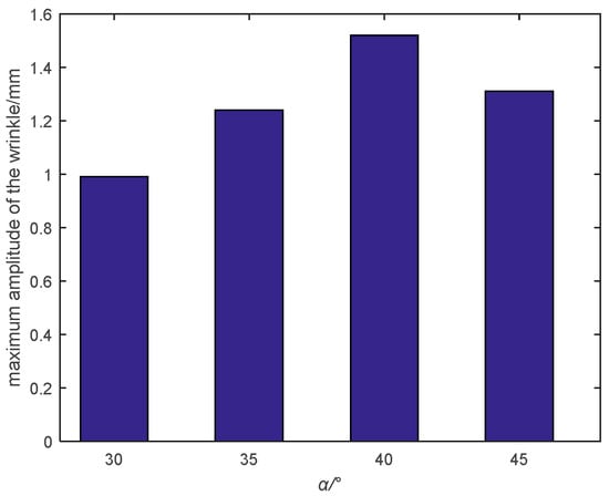 The variation of the maximum amplitude of the wrinkle with the direction of the force is shown in Figure 19. When , the maximum amplitude of the wrinkle is 1.24 mm, and the error is 40% compared to 1.74 mm in the simulation analysis results. With the increase in ,the force direction gradually approaches the edge of the membrane, and so the membrane is more prone to buckling and forming wrinkles, resulting in the increase in amplitude. However, since the edge hemming of the membrane adopts a manual viscose, when , the force direction is too close to the edge and the wrinkle is affected by the edge hemming, and so the wrinkling amplitude does not continue to increase, but decreases instead.