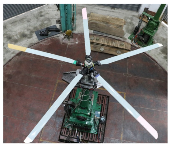 The assays were completed on the Φ4 m rotor test stand at CARDC. The rotor test stand utilized in the assays is presented in Figure 1, which is electrically driven with the maximal output power of 380 kW. The maximum rated velocity of the rotor shaft is 1050 rpm, and its control accurateness is better than 1‰. The range of the blade CPA was between 0° and +12°, which had the control accurateness better than 0.1°.